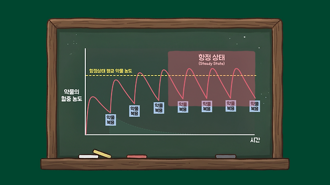 이는 많은 만성질환 약물이 작용 발현까지 시간이 걸리는 대신 약효가 반으로 줄어드는 반감기가 길고, 약물의 흡수·투여 속도와 배설 속도가 평형을 이루어 체내 약물 농도가 일정 수준으로 유지되는 항정 상태에서 작용하기 때문입니다. 즉, 약물 효과가 단일 용량이 아닌 누적된 체내 농도에 의해 결정됩니다.