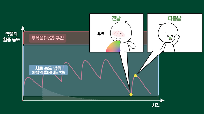 또 하나 중요한 개념은 치료 농도 범위(Therapeutic range)입니다. 치료 농도 범위가 좁은 약물은 혈중 농도의 작은 변화도 몸에 영향을 크게 미칠 수 있습니다. 따라서 구토 후 재복용 여부를 신중히 결정해야 하고, 대표적으로 항경련제, 항부정맥제, 면역 억제제 등이 해당합니다.