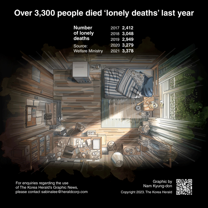 According to the report released by the Welfare Ministry, there were 3,378 lonely deaths nationwide in 2021, up from 3,279 in 2020, 2,949 in 2019.