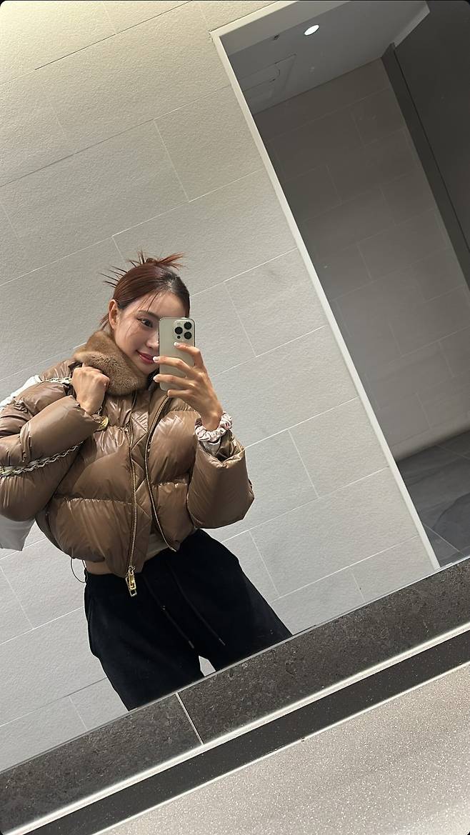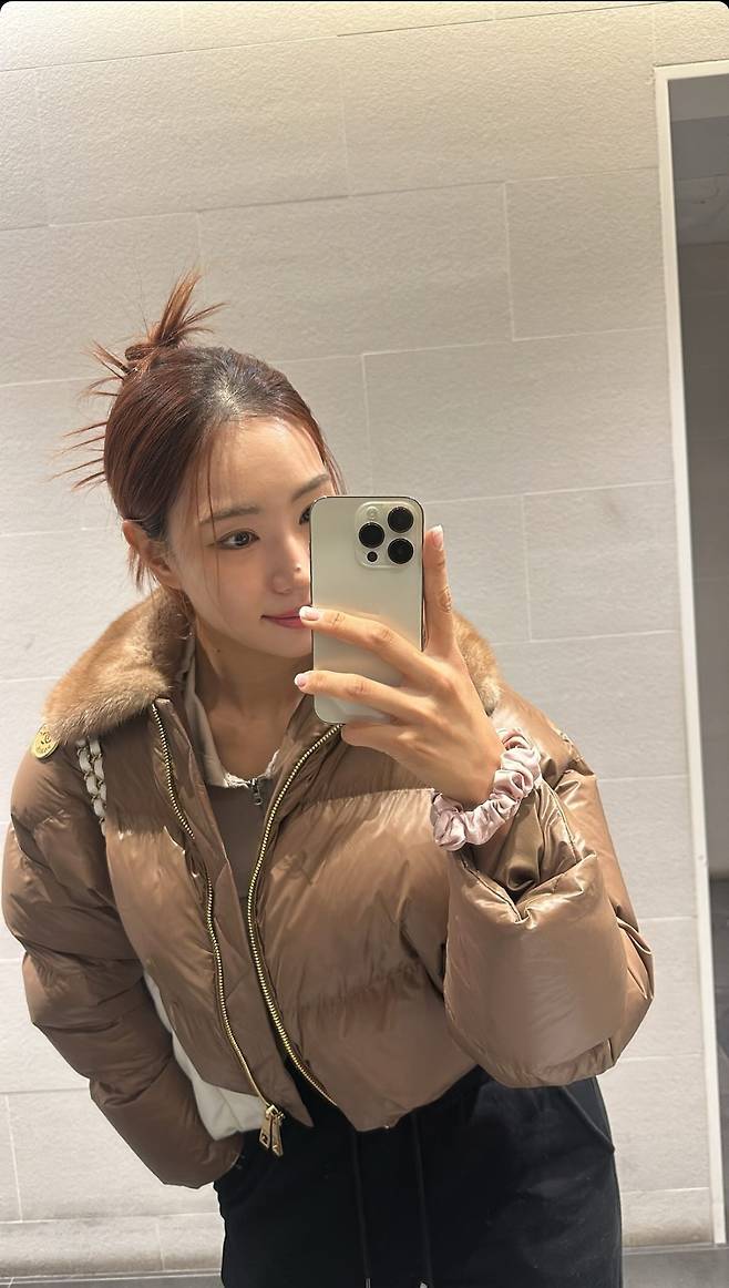 유현주는 부드러운 광택이 돋보이는 브라운 크롭 패딩을 입고 따뜻함과 고급스러움을 동시에 연출했습니다.