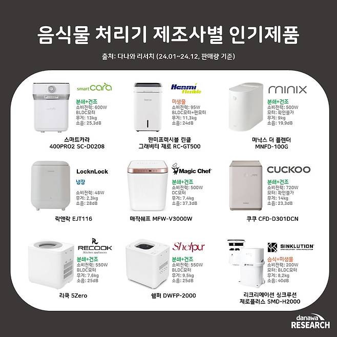 한미프렉시블 림쿡 그래비티 제로 RC-GT500은 미생물 발효 방식으로, 95W 저전력과 24dB의 저소음이 특징이다. 락앤락 EJT116은 48W 냉장 방식으로, 음식물 보관이 필요한 소비자층을 겨냥했다. 또한 리크리에이션 제로플러션 SMD-H2000은 200W급 습식분쇄+미생물 방식으로, 40dB 소음 수준을 유지한다.
