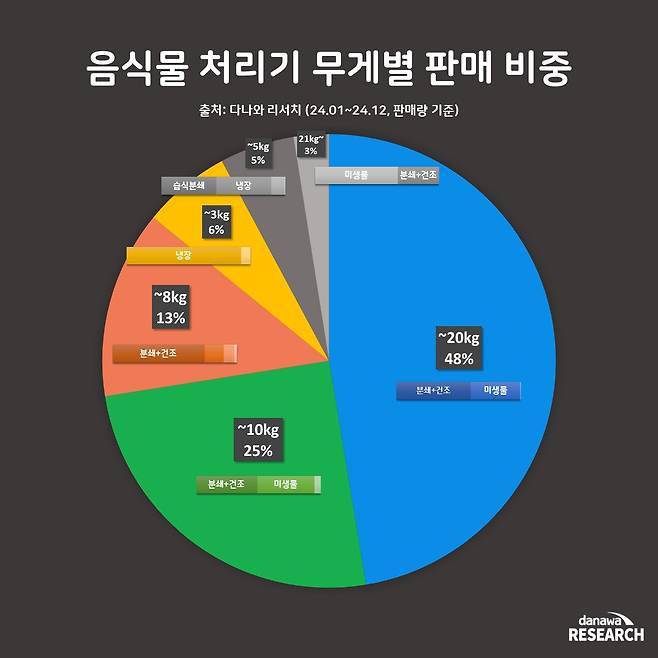 음식물 처리기의 무게는 처리 용량과 탑재된 모터 종류에 따라 다양하게 구성된다. 2024년 판매된 제품 중 48%가 20kg급으로, 주로 분쇄+건조 및 미생물 방식에서 사용되고 있다. 10kg급 제품은 25%의 점유율을 기록하며, 이 역시 분쇄+건조 및 미생물 방식이 주를 이룬다. 이어서 8kg급 제품이 13%를 차지하며 대부분 분쇄+건조 방식이 적용되었다. 한편, 3kg급 제품은 6%의 점유율을 보였으며, 주로 냉장 방식에서 활용되는 것으로 나타났다.