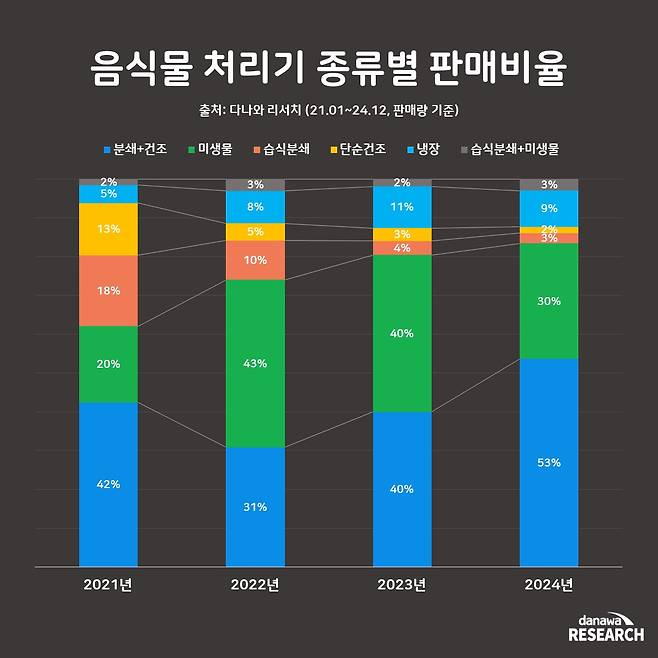 지난 2021년부터 2024년까지의 음식물 처리기 종류별 판매비율을 살펴보면, 분쇄+건조 방식 음식물 처리기의 판매 비중이 증가세를 보이며 시장을 주도하고 있다. 2021년 42%였던 분쇄+건조 방식의 점유율은 2022년 31%로 감소했지만, 2023년 40%, 2024년 53%로 크게 증가했다. 반면, 2022년 급성장했던 미생물 방식은 43%에서 2024년 30%로 하락세를 보였다. 이는 분쇄+건조 방식의 강력한 감량 효과와 간편함이 다시 주목받고 있음을 의미한다.