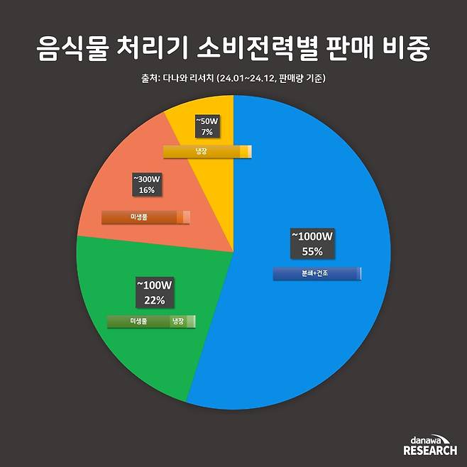2024년 판매된 음식물 처리기 중 55%가 1000W급 제품으로, 주로 분쇄+건조 방식에서 사용된다. 분쇄+건조 방식은 강한 출력으로 빠르고 효과적인 감량이 가능해 소비자들의 선호도가 높은 것으로 보인다. 100W 이하 소비전력을 가진 제품은 전체 판매량의 22%를 차지했으며, 미생물과 냉장 방식이 주요 제품군이다. 300W급 제품(16%)은 주로 미생물 방식에서 사용되며, 50W 이하(7%)는 냉장 방식이 주를 이뤘다. 정리하면, 분쇄+건조 방식을 찾는 소비자들은 높은 소비전력을 감수하고 사용중이며, 나머지 방식의 제품들은 소비전력이 고루 분포되어있다.