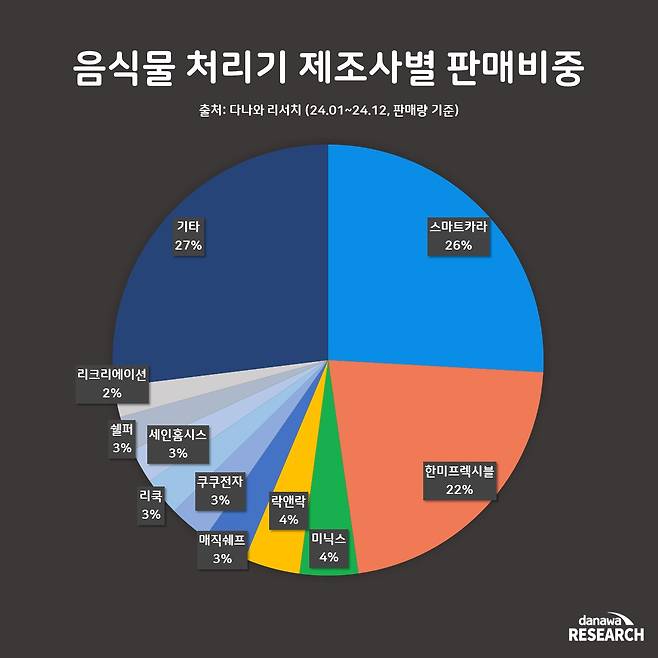 스마트카라와 한미프렉시블이 시장을 주도하며 음식물 처리기 업계를 양분하고 있다. 스마트카라는 26%, 한미프렉시블은 22%의 점유율을 기록하며, 두 브랜드가 전체 시장의 절반가량을 차지하고 있다. 두 업체 모두 분쇄+건조 방식 제품을 주력으로 하며, 강력한 감량 효과와 사용자 편의성을 강조한 제품군이 인기를 끌고 있다.