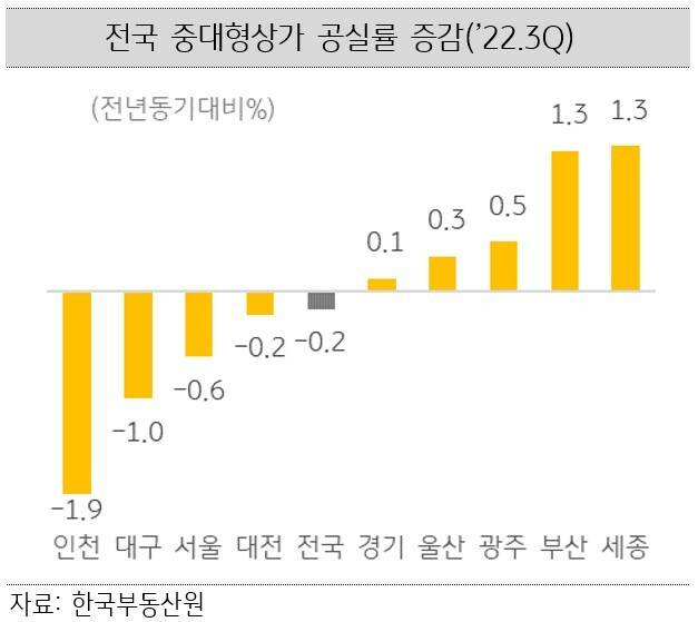 공실률 변동성 증가에 따라 코로나 이전 수준의 임대료 회복은 장기화될 것으로 예상됩니다. 공실률은 전년동기 대비 인천 -1.9%p, 대구 -1%p 하락했고, 부산 1.3%p, 세종 1.3%p 증가했습니다. 경기침체 우려로 숙박ㆍ음식업 신규창업의 -11.9% 감소가 상가임대차 수급에 악영향을 줬습니다.