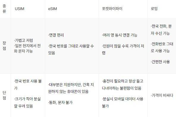 일본 여행을 준비하면서 데이터와 와이파이 중 고민이 되실텐데요. 일본 여행을 가서 모바일 데이터를 사용하는 방법은 총 네 가지가 있습니다. 아래의 표를 통해 장단점을 비교해 보세요.