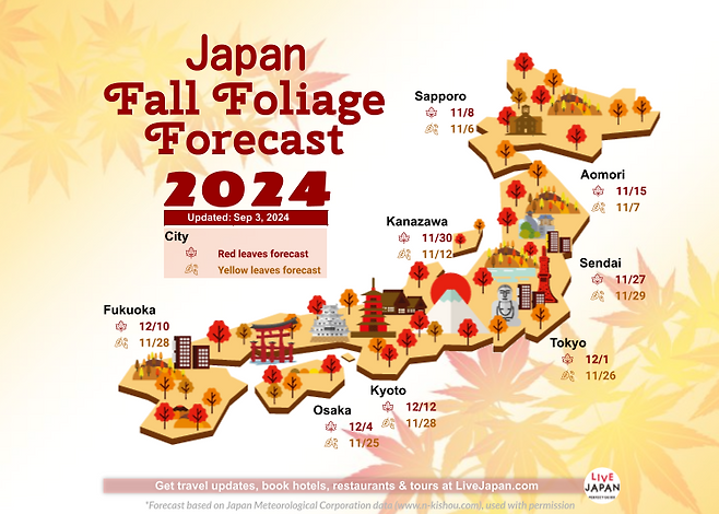 또한, 10월 중순인 현재 일본은 가을 나무로 서서히 물들어가는 시기인데요. 주요 도시인 도쿄 11/26 오사카는 11/25, 교토 11/28, 삿포로 11/6, 후쿠오카 11/28 등 일본 단풍 절정의 시기입니다. 지역마다 조금씩 차이가 있는 것을 알 수 있습니다.