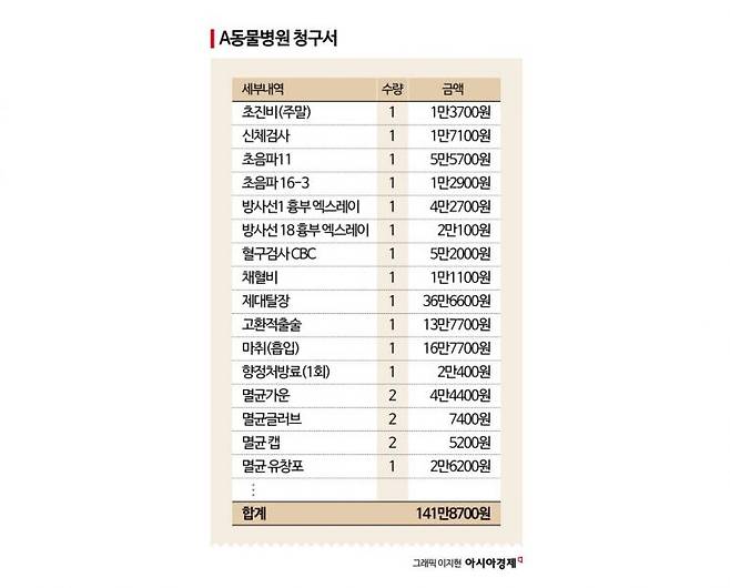 명세서를 받아 들고 나서야 세부 내역이 눈에 들어왔다. 초진비 1만3700원, 초음파 검사 5만5700원, 방사선 촬영 4만2700원, 혈구검사 5만2000원, 혈액가스 검사 5만8700원, 제대탈장 수술비 36만6600원, 고환적출술 13만7700원, 마취비 16만7700원, 멸균가운 4만4400원 등 27개 항목이 촘촘히 쪼개져 있었다.