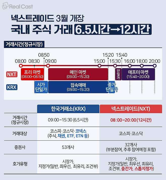 넥스트레이드와 한국거래소의 가장 큰 차이는 거래시간입니다. 9시부터 3시 30분까지 정규 거래시간을 운영하는 한국거래소와 달리, Pre마켓(08:00~08:50)과 After마켓(15:30~20:00) 시간을 추가로 제공합니다.