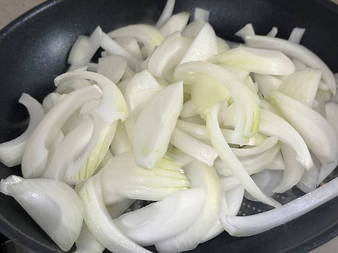 양파는 약 0.5~1cm 두께로 썰어 주세요. 식감이 살짝 씹히는 게 좋다면 1cm 정도로 썹니다. 기름을 두르고 양파가 투명해질 때까지 볶습니다.