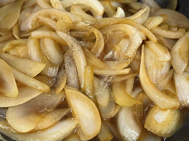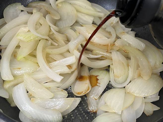 양파가 투명하면서 노릇하게 익기 시작하면 간을 해줍니다. 간장 3 스푼, 물 6 스푼을 넣으세요. 간장과 물의 양은 기호에 따라 충분히 조절하시면 됩니다.