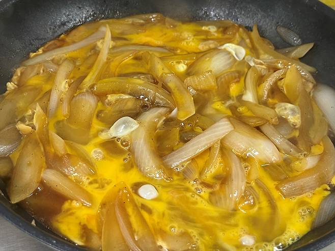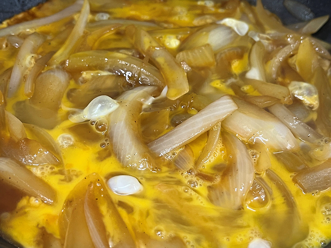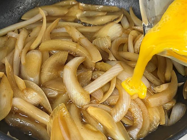 양파에 양념이 적당히 배고, 자작하게 졸아들면 풀어놓은 계란물을 붓습니다. 전체적으로 빙 둘러서 부어 주세요.