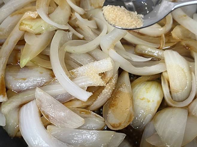설탕을 커피 스푼으로 1/2 스푼 넣어 주세요. 양파 자체에도 단 맛이 있기 때문에 설탕이 많이 들어가지 않아도 됩니다.
