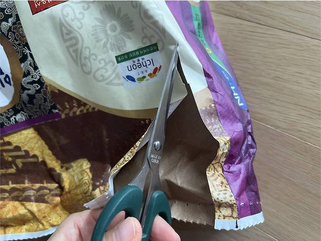 1. 겉포장 1겹은 예쁘지 않아 가위로 잘라내서 벗겨주세요 여러 장으로 되어 있어 쉽게 벗겨낼 수 있습니다. 이렇게 벗겨내면 크라프트 재질의 종이만 남습니다.
