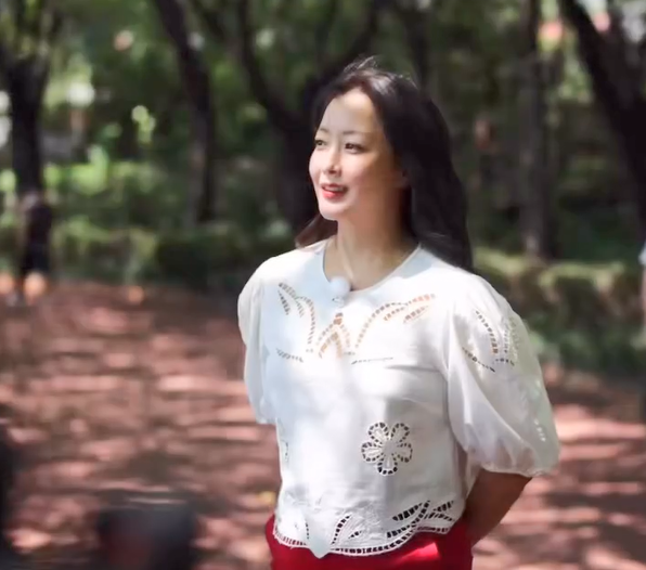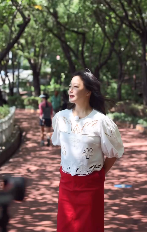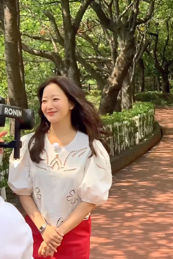 최근 공개된 사진 속 김희선은 흔한 '펀칭 화이트 블라우스'에 '레드 스커트'를 입었을 뿐이다.