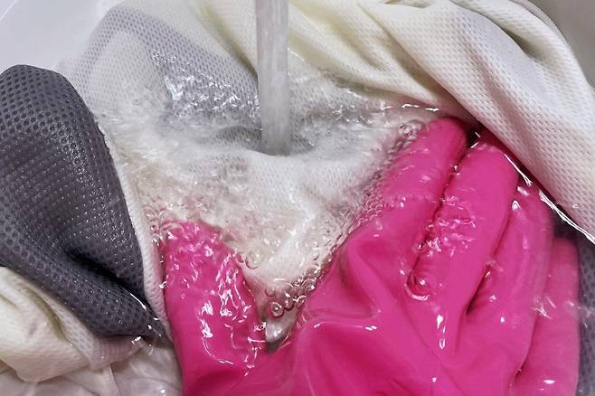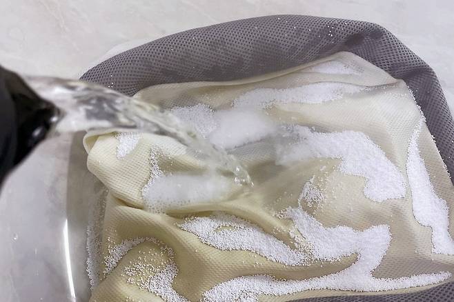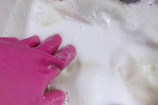 이때 가스가 발생하니 꼭 환기하시고 고무장갑 착용 후 작업하세요. 베개커버가 폭 잠기도록 해줍니다. 이대로 20분 정도만 그대로 두세요. 비벼 빨지 않아도 됩니다.