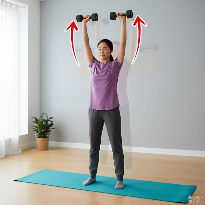 상체의 탄력이 줄어드는 시기에 가장 먼저 눈에 띄는 부위는 어깨와 팔 라인이다. 이를 개선하려면 덤벨을 활용한 간단한 리프팅 동작이 도움이 된다. 양손에 아령을 잡고 어깨 넓이로 선다. 팔을 머리 위로 곧게 들어 올린 뒤, 팔꿈치를 구부리며 W자 형태로 내린다. 다시 천천히 팔을 펴 올리며, 원래 자세로 돌아온다.