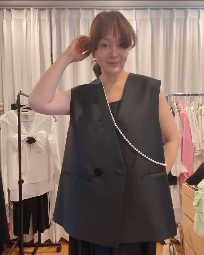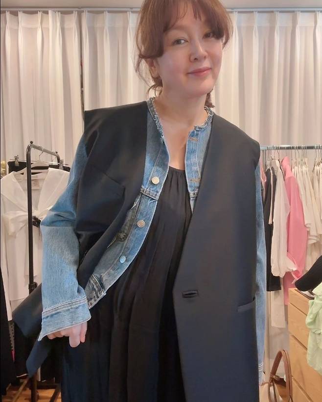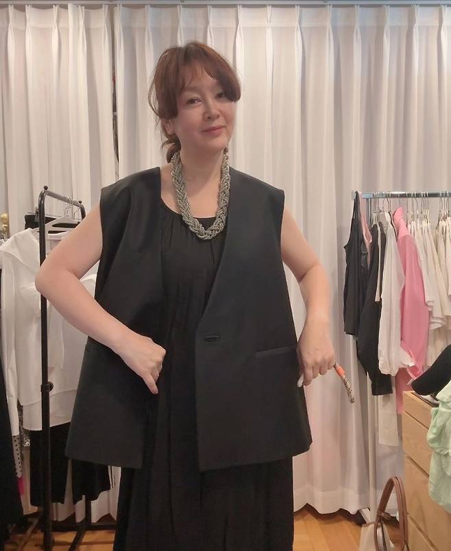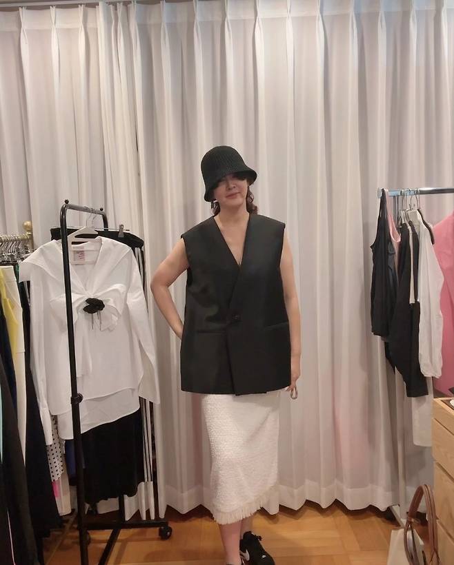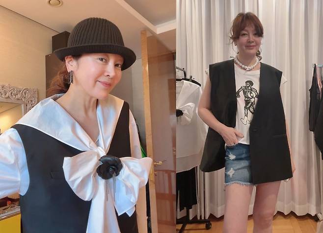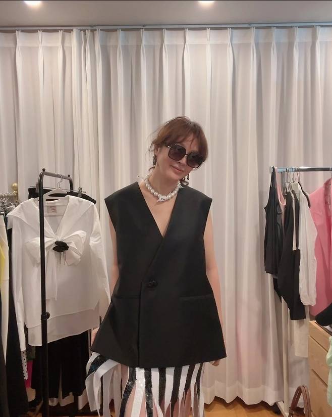 이승연은 블랙 베스트 재킷을 다양한 코디로 착용해 스타일리시하고 멋스러운 모습을 뽐냈습니다.