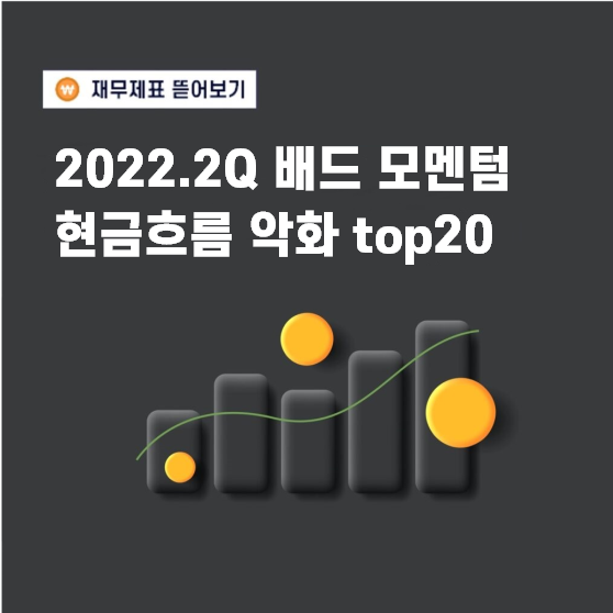 이번 스토리에서는 이 중 2022년 2분기 시가총액 1조원 이상 상장기업 기준 ‘배드 모멘텀’이 발생한 상위 20개 기업을 소개합니다. 다만 지표를 보고 해석할 때, 배드모멘텀이 발생했다고 해서 무조건 안좋다는 뜻은 아님을 참고하세요. 모든 재무지표는 그 기업이 처한 상황을 함께 고려해서 해석해야 합니다.