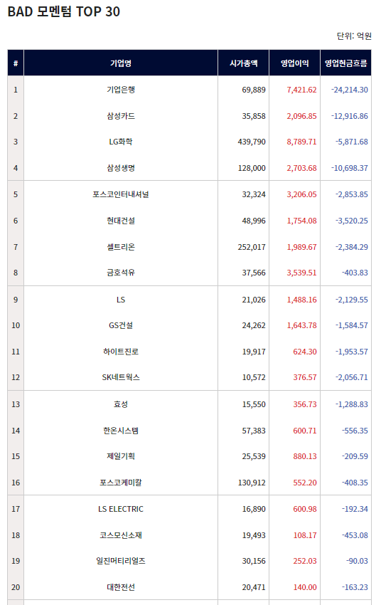 따라서 은행·카드사에 투자를 고려할 땐 은행·카드사의 현금흐름표를 참고 지표에서 제외하셔야 합니다. <넘버스>의 배드모멘텀 지표도 은행·카드사에는 적용하기 어렵다는 점을 참고하세요.