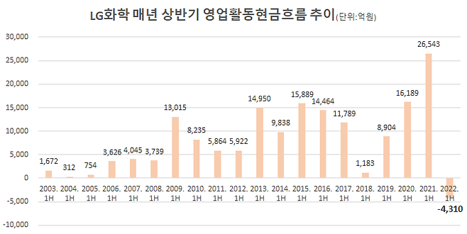 제 생각이 맞았습니다. 매년 상반기 LG화학이 영업활동현금흐름 적자를 기록한 적은 2022년 2분기를 빼고 단 한번도 없었습니다.