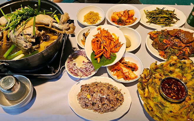오리백숙, 솥뚜껑 버섯백숙, 닭볶음탕, 더덕불고기, 오리로스 등 전통 한식 다양