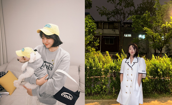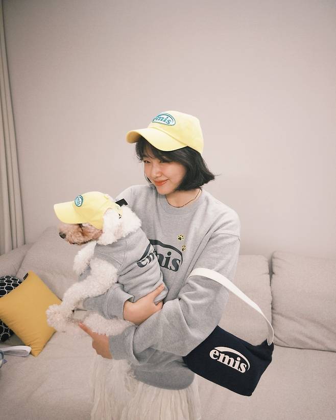 집에서의 편안한 모습을 담은 이 사진에서 강미나는 그레이 컬러의 스웨트셔츠와 팬츠로 구성된 홈웨어 세트를 착용하고 있다. 옐로우 컬러의 캡과 매칭되는 반려견의 모자가 사랑스러운 포인트를 연출하며, 편안하면서도 스타일리시한 일상복 패션을 보여주고 있다.