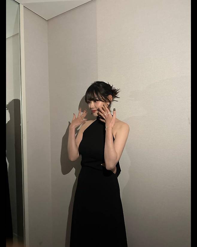 실내에서 촬영된 이 컷에서 강미나는 홀터넥 디자인의 블랙 드레스로 우아한 매력을 발산하고 있다. 목 부분을 감싸는 홀터넥 스타일이 어깨 라인을 강조하며, 미니멀한 블랙 컬러가 세련된 분위기를 자아내고 있다. 심플하면서도 고급스러운 실루엣으로 모던한 여성미를 표현하고 있다.