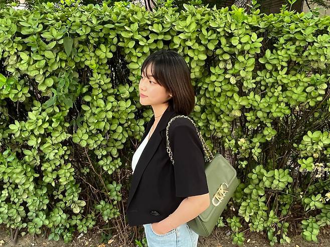 강미나는 검은색 블레이저와 데님 팬츠를 매치한 캐주얼 시크 스타일을 연출하고 있다. 올리브 그린 컬러의 체인백을 포인트 아이템으로 활용해 전체적인 룩에 세련미를 더했다. 블레이저의 깔끔한 실루엣과 편안한 데님의 조화가 일상 속에서도 품격 있는 스타일을 완성하고 있다.