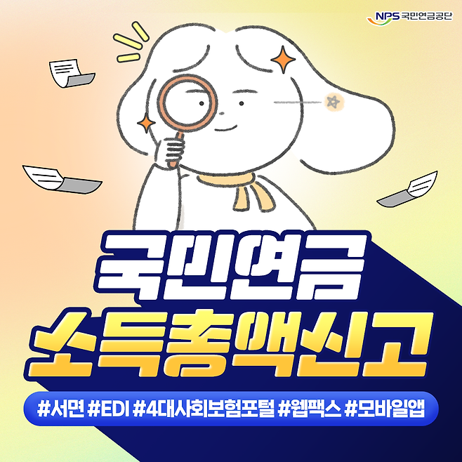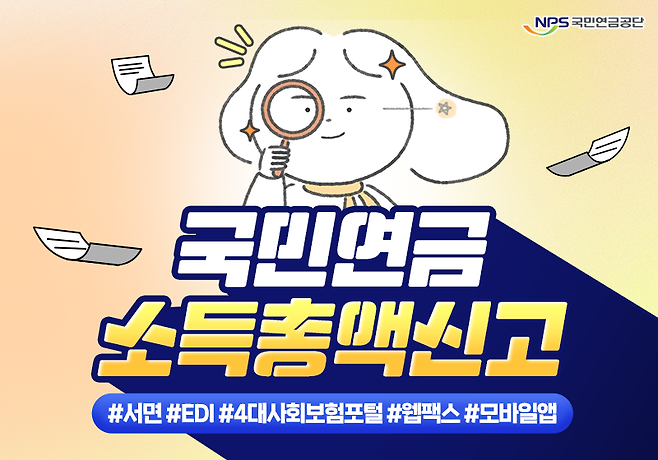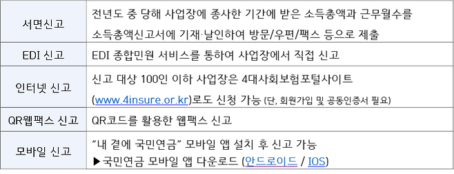 ▷ 소득총액 신고방법: 서면(방문, 우편, 팩스), 국민연금 EDI, 4대사회보험포털, QR웹팩스, 모바일 앱