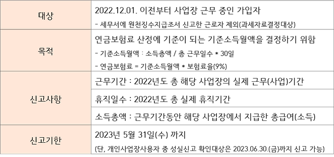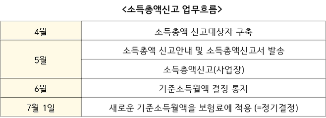 ▷ 국민연금 소득총액신고: 올해 7월부터 내년 6월까지 적용할 기준소득월액을 결정하기 위해, 가입자별 전년도의 소득총액을 공단에 신고하는 일련의 과정