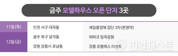 금주 모델하우스 오픈 예정 현장은 총 3곳으로 인천과 광주, 강원 강릉에 위치하고 있습니다.