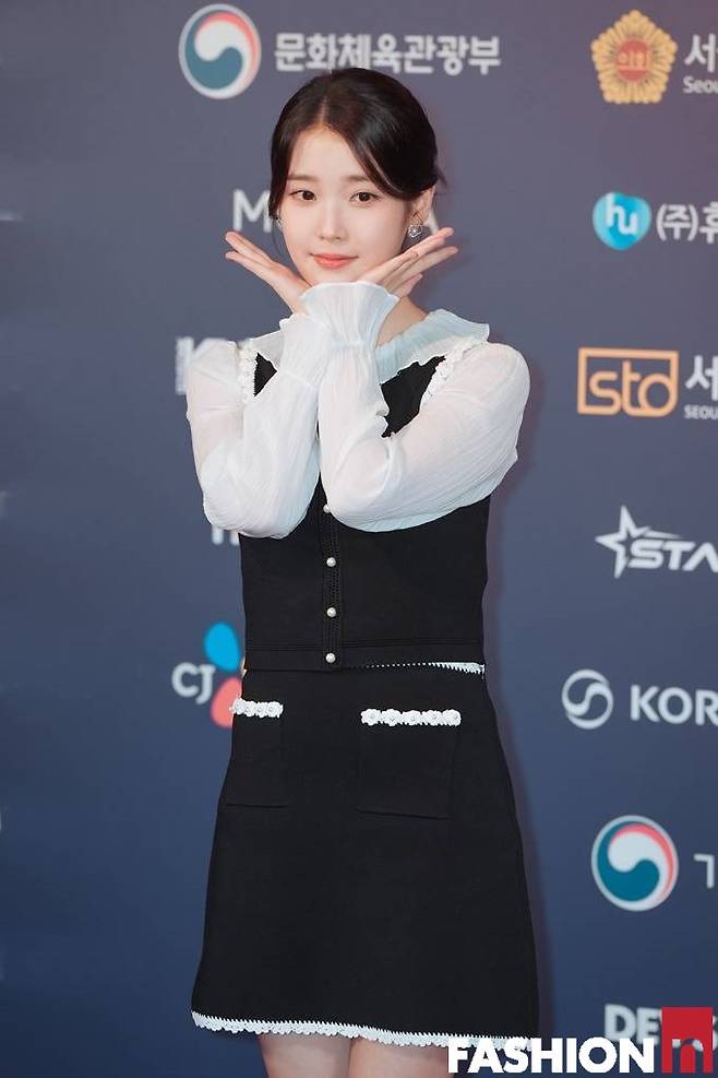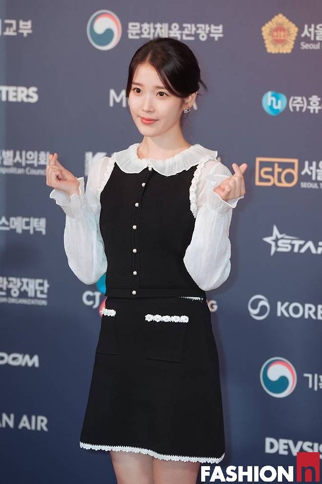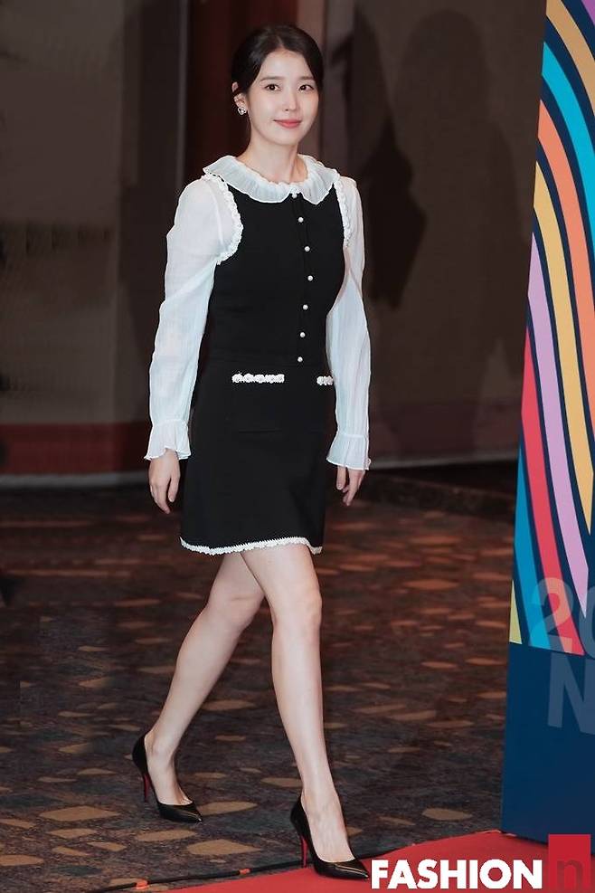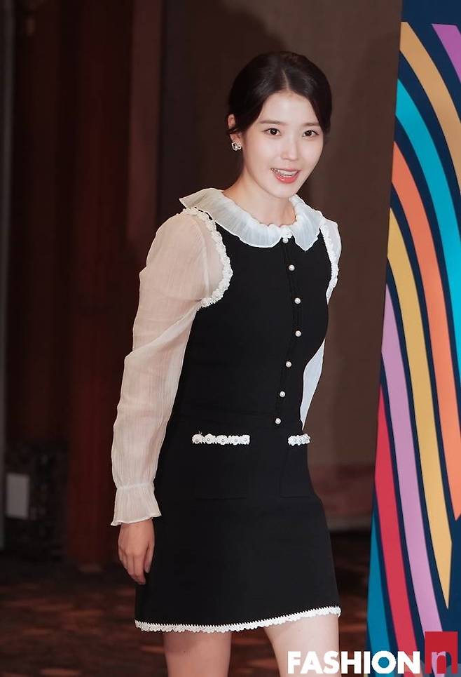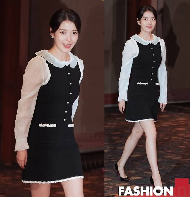 이날 아이유는 넥라인과 소매라인의 러플 장식이 돋보이는 러블리한 보색 블랙앤화이트 원피스룩으로 사랑스러운 미모를 빛냈다.