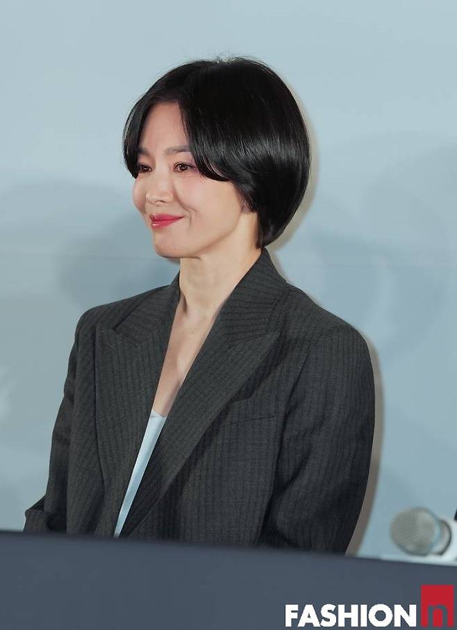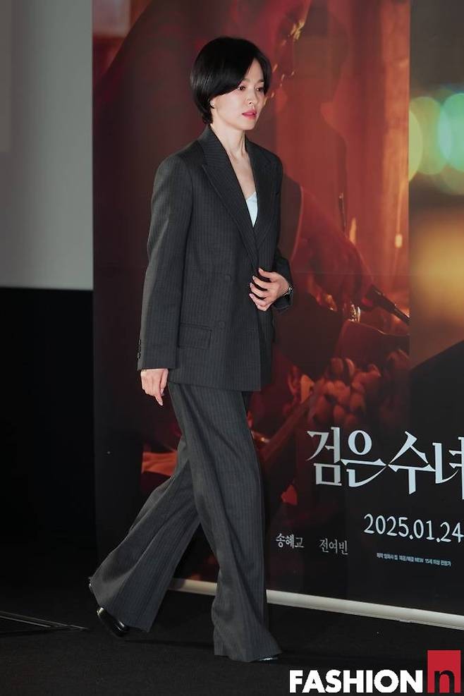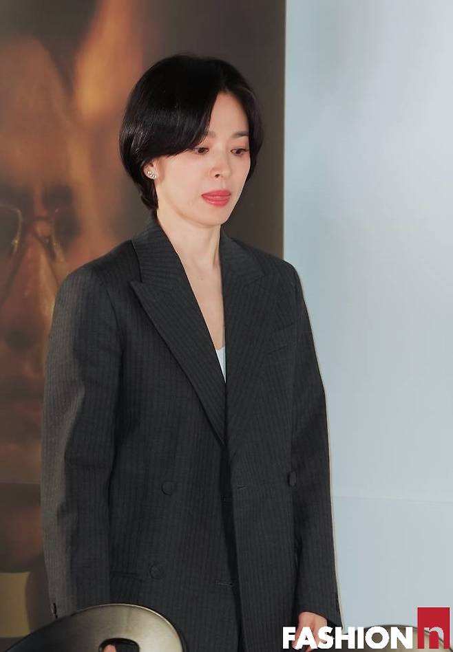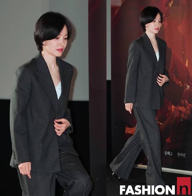 특히 송혜교는 잔잔한 그레이 스트라이프 더블 재킷과 와이드 팬츠 셋업의 파워우먼 슈트룩으로 변함없는 특유의 지적인 카리스마를 발산했다.