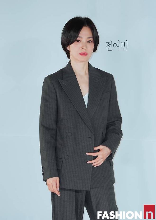 배우 송혜교가 스트라이프 테일러드 슈트룩으로 지적인 매력을 발산했다.