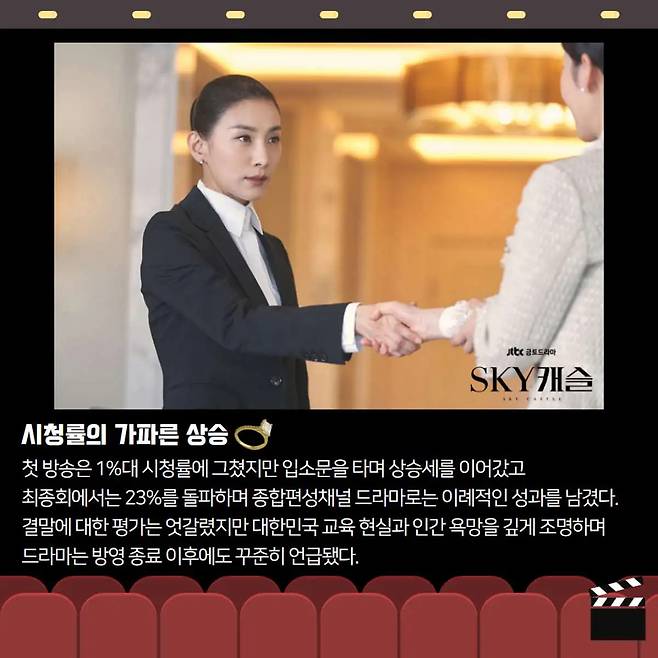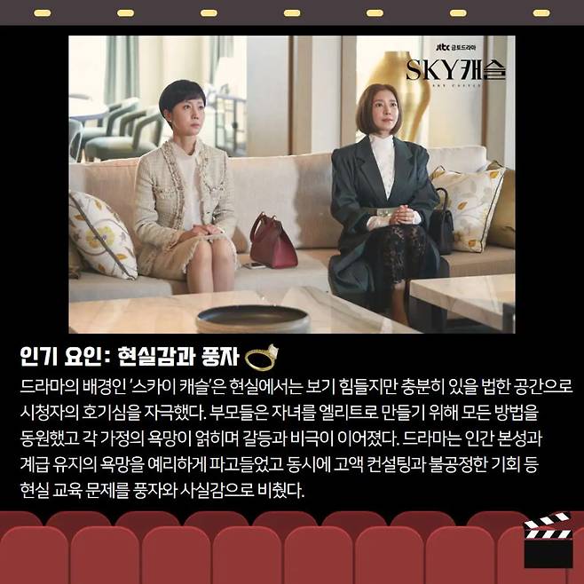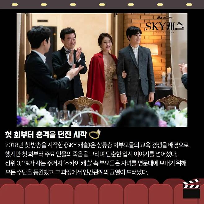 ๋ฐฉ์์ ์์ํ ใSKY ์บ์ฌใ์ ์๋ฅ์ธต ํ๋ถ๋ชจ๋ค์ ์น์ดํ ๊ต์ก ๊ฒฝ์์ ๋ฐฐ๊ฒฝ์ผ๋ก ํ์ต๋๋ค. ํ์ง๋ง ์ฒซ ํ๋ถํฐ ์ฃผ์ ์ธ๋ฌผ์ ์ฃฝ์์ ๋ค๋ฃจ๋ฉฐ ๋จ์ํ ์