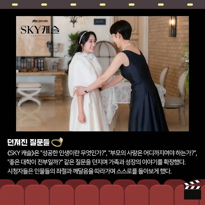 โ ๋์ ธ์ง ์ง๋ฌธ๋คใSKY ์บ์ฌใ์ โ์ฑ๊ณต์ด๋ ๋ฌด์์ธ๊ฐ?โ, โ๋ถ๋ชจ์ ์ฌ๋์ ์ด๋๊น์ง์ธ๊ฐ?โ, โ์ข์ ๋ํ์ด ์ ๋ถ์ผ๊น?โ ๊ฐ์ ์ง๋ฌธ์ ๋์ก์ต๋๋ค. ์ธ๋ฌผ๋ค์ ์ข์ ๊ณผ ๊นจ๋ฌ์์ ๋ฐ๋ผ๊ฐ๋ฉฐ ์์ฒญ์ ์ค์ค๋ก๋ฅผ ๋์๋ณด๊ฒ ํ ์ํ์ด์์ต๋๋ค. ๐