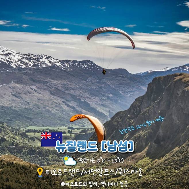 뉴질랜드 남섬의 여름은 남반구로 우리나라의 봄 날씨와 비슷한데요. 온화하고 쾌적한 날씨로, 장엄한 피오르드 해안, 서던 알프스의 빙하, 수정처럼 맑은 호수 등 액티브한 자연 경관을 탐험하기에 최적의 시기라할 수 있습니다.