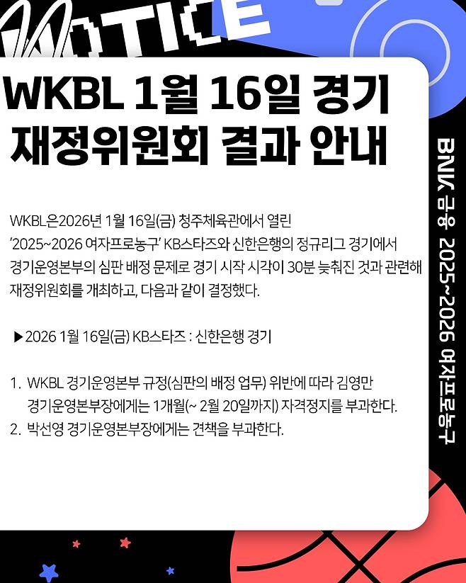 사상 초유의 '심판 미배정' 사태로 여자프로농구 청주 KB와 인천 신한은행의 경기가 지연되게 한 김영만 한국여자농구연맹(WKBL) 경기운영본부장이 징계를 받았다.