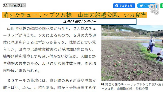 원래 꽃사슴 개체 수가 많은 일본에선 겨울에 사슴을 사냥해 고기를 먹는 문화가 퍼져있는데 최근엔 개체 수 증가로 농작물 피해가 커지고 있다고 한다. 홋카이도 언론 보도에선 이렇게 사슴에 의한 피해를 소개하는 기사들이 눈에 띈다.