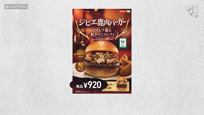 이 광고를 보라. 일본 롯데리아가 9월 29일부터 10월 12일까지 2주간 한정 판매로 ‘수렵 사슴 고기 버거’를 출시했다는 내용이다. 야생 사슴을 사냥한 고기에 송로버섯을 올리고 레드와인 소스까지 뿌렸다니 고급져보이고 맛도 나쁘지 않을거 같다. 단품 가격 920엔(9148원)에 이르는 이 버거를 한국 롯데리아에선 팔 생각 없을까.
