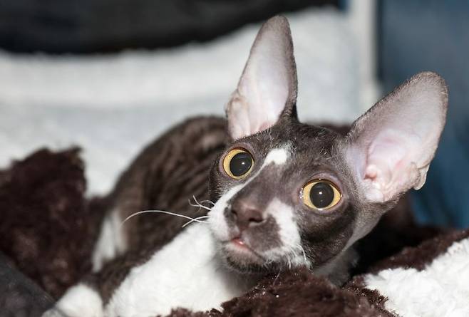 코니시 렉스는 가늘고 촘촘한 속털만 있어 추위에 약해요. 추운 겨울철 저체온증에 걸리지 않게 실내 온도에 신경 쓰는 게 좋습니다.