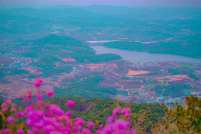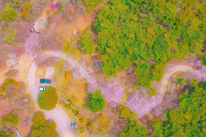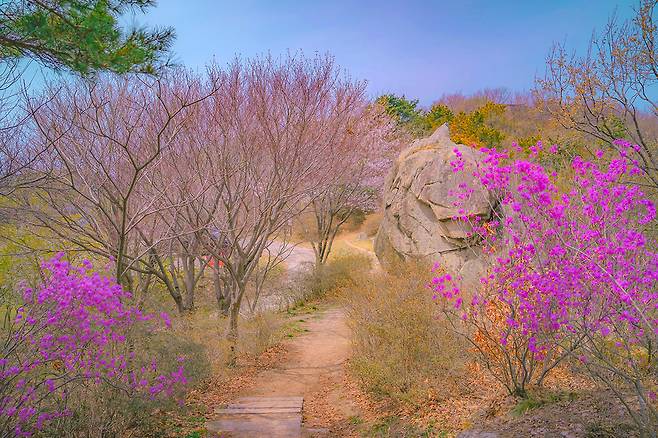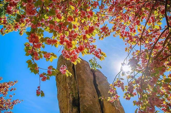 오르는 길에 드문드문 보이는 진달래와 겹벚꽃, 그리고 오밀조밀 모여 있는 바위들은 잠시 머물며 사진을 찍기에도 제격입니다.