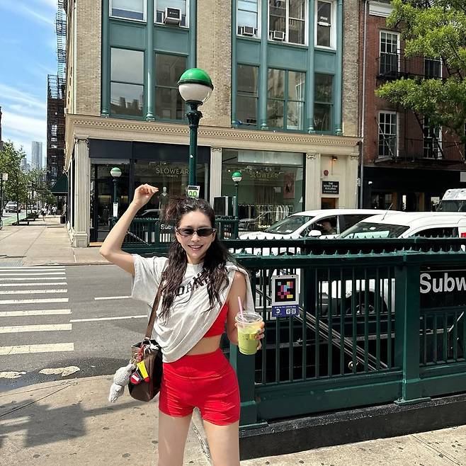 햇살 가득한 뉴욕 거리, 지하철 입구 앞에서 포착된 이유빈의 모습이 여름의 한복판을 시각적으로 증명한다. 그녀는 시원한 그린 스무디 한 잔을 손에 든 채, 당당하고 활기찬 포즈로 도심의 에너지를 담아냈다. 단 하나의 색으로 존재감을 각인시키는 ‘원 컬러 룩’은 이번 시즌 가장 뜨거운 트렌드 중 하나로, 이유빈은 그 정석을 제대로 보여준다.