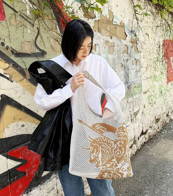 가장 눈에 띄는 포인트는 그녀가 어깨에 걸친 니트 소재의 버버리 우븐백이었다. 베이지와 카멜 컬러로 그래픽 패턴이 들어간 이 백은 부드러운 짜임과 유연한 형태로 가벼운 스타일링에 자연스럽게 녹아들었다. 니트 짜임의 특성상 공기처럼 가벼운 느낌을 주며, 데일리 룩에 실용성과 멋을 동시에 더하는 아이템으로 존재감을 발휘했다.