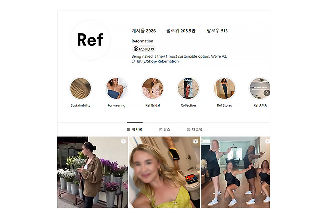 리포메이션은 고객과 관계 맺기에 능숙하다. 리포메이션 공식 계정에는 일반 고객의 사진이 눈에 띄게 많다. 리포메이션의 상품을 착장하고 개인 계정에 리포메이션을 태그하면 리포메이션 공식계정이 전문 모델 사진 옆에 고객의 게시물을 소개한다. 브랜드와 함께하고 있다는 친밀감은 물론, 다른 사람들의 옷차림도 쉽게 참고할 수 있다.