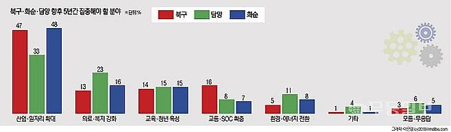 6일 무등일보가 뉴시스 광주전남취재본부, 광주MBC와 공동으로 여론조사 전문기관 코리아리서치에 의뢰해 지난 2일부터 3일까지 광주 북구 501명·담양 502명·화순 500명의 성인남녀를 대상으로 실시한 여론조사 결과, 북구는 47%, 담양은 33%, 화순은 48%가 '산업·일자리 확대'를 가장 시급한 현안으로 꼽았다.