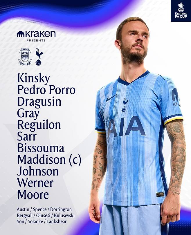 뚜껑이 열렸다. 양민혁의 이름은 없었다. 캡틴 손흥민도 벤치 명단에 이름을 올렸다. 그나마 어린 선수는 마이키 무어 정도였다. 나머지는 대부분 1.5군 선수들을 출전시켰다. 5부리그인 탐워스를 존중해도 너무나 존중해주었다.