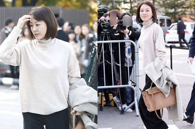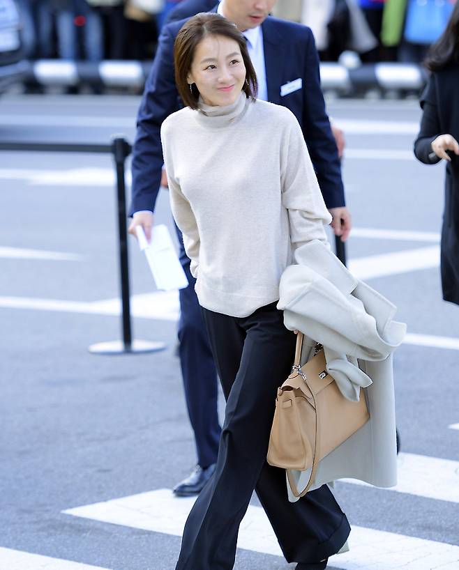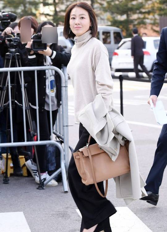 그녀는 블랙 슬랙스와 캐시미어 니트, 에르메스 켈리백, 하이힐을 매치해 고급스럽고 절제된 스타일을 완성했다.